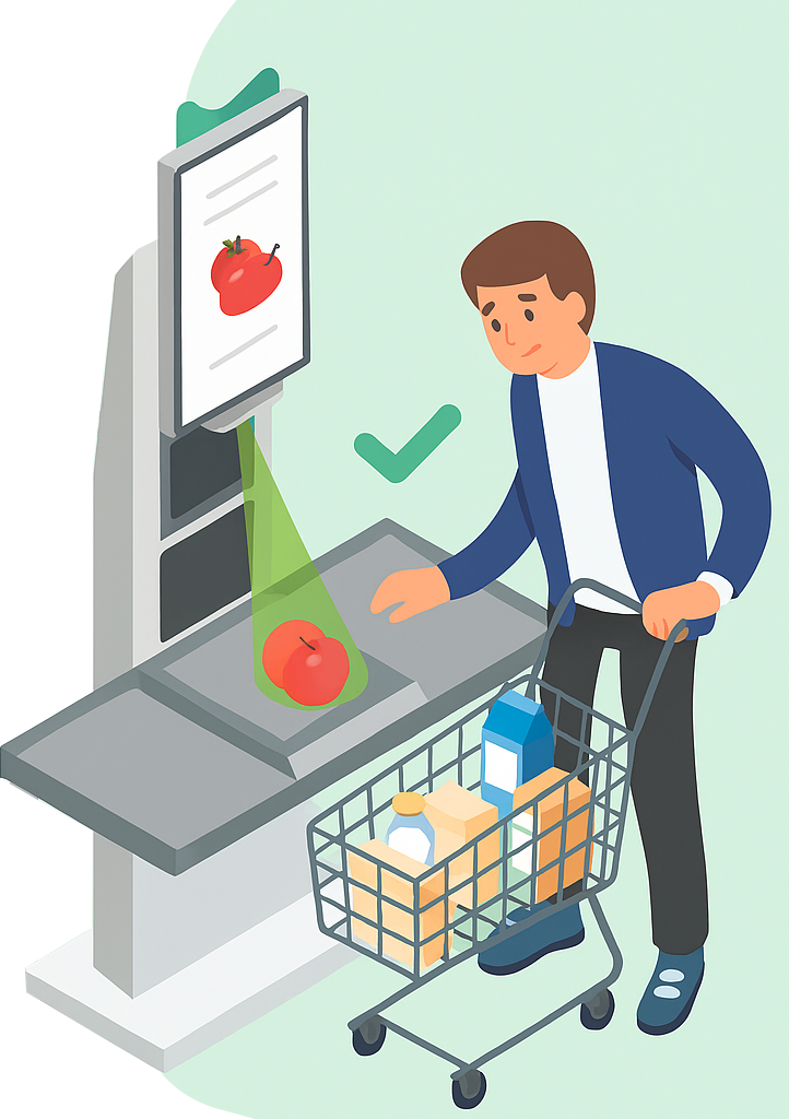 Пользователь (кассир или покупатель) подтверждает верный товар, и система запоминает это — распознавание становится точнее с каждым разом.